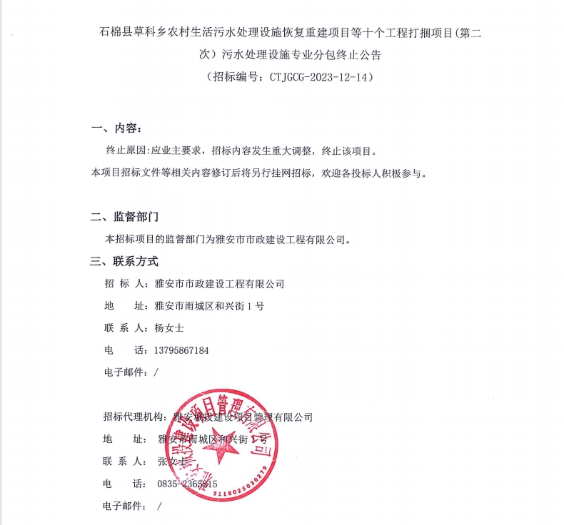 石棉縣草科鄉(xiāng)農(nóng)村生活污水處理設(shè)施恢復(fù)重建項目等十個工程打捆項目(第二次)污水處理設(shè)施專業(yè)分包終止公告