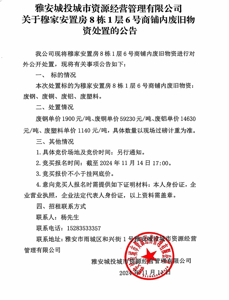 雅安城投城市資源經(jīng)營(yíng)管理有限公司關(guān)于穆家安置房8棟1層6號(hào)商鋪內(nèi)廢舊物資處置的公告公告