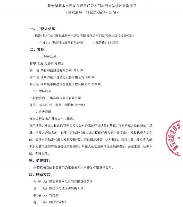 雅安城利水電開發(fā)有限責(zé)任公司門坎石電站遠(yuǎn)控改造項目結(jié)果公示