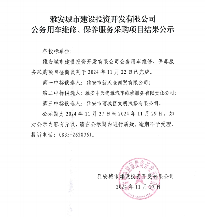 雅安城市建設(shè)投資開發(fā)有限公司公務(wù)用車維修、保養(yǎng)服務(wù)采購項(xiàng)目結(jié)果公示