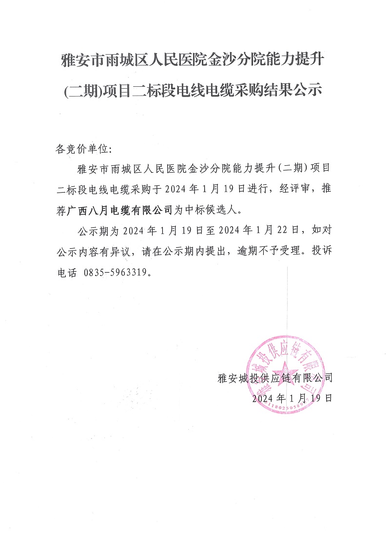 雅安市雨城區(qū)人民醫(yī)院金沙分院能力提升(二期)項目二標段電線電纜采購結果公示