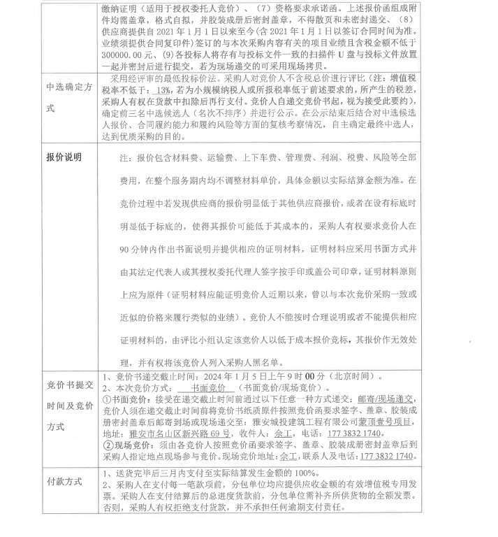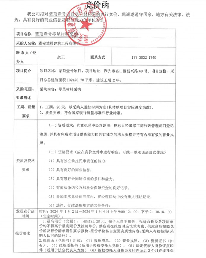 蒙頂壹號(hào)零星材料采購競價(jià)公告