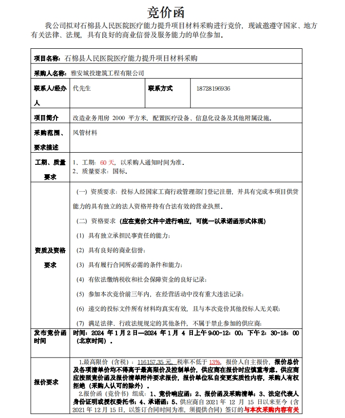 石棉縣人民醫(yī)院醫(yī)療能力提升項目材料采購競價公告