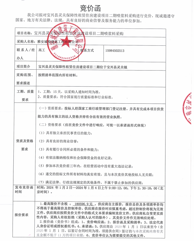 寶興縣靈關(guān)保障性租賃住房建設(shè)項(xiàng)目二期噴漿料采購(gòu)競(jìng)價(jià)公告