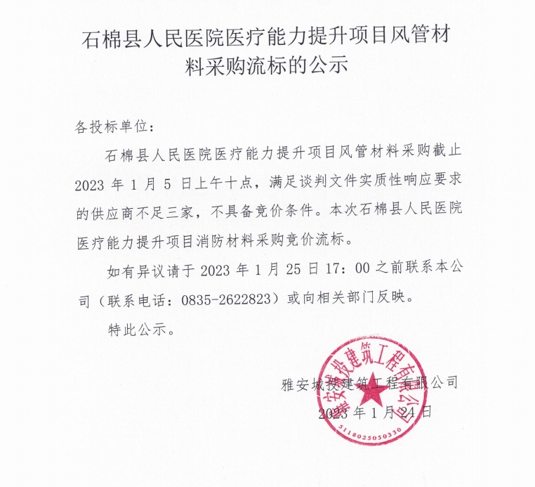石棉縣人民醫(yī)院醫(yī)療能力提升項目風(fēng)管材料采購流標(biāo)的公示