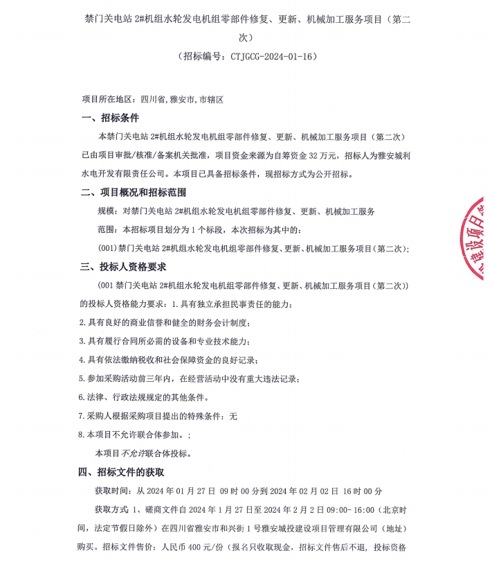 禁門關(guān)電站2#機組水輪發(fā)電機組零部件修復(fù)、更新、機械加工服務(wù)項目(第二次)公告