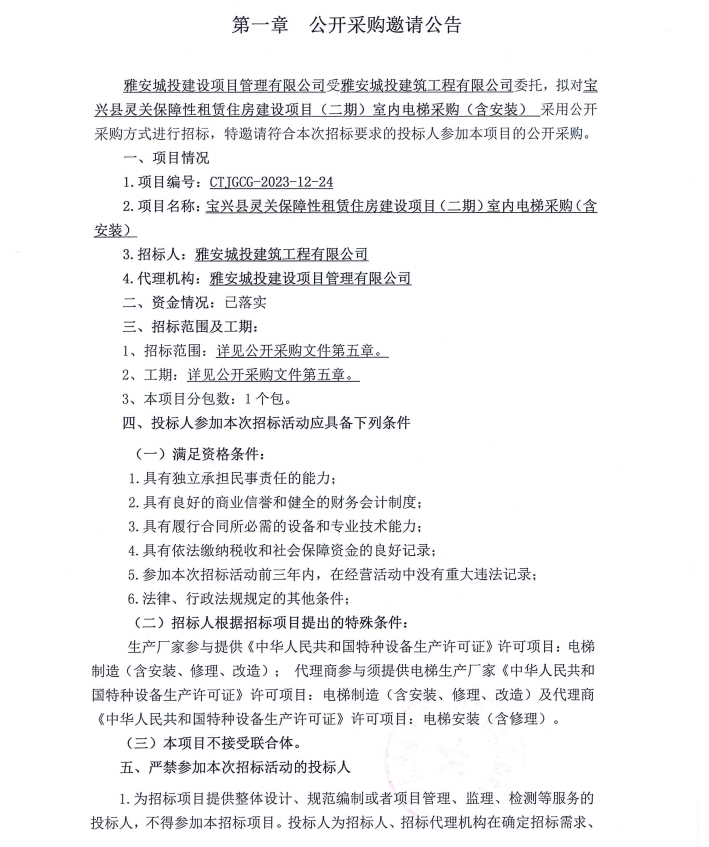 寶興縣靈關(guān)保障性租賃住房建設(shè)項(xiàng)目(二期)室內(nèi)電梯采購(含安裝)公開采購邀請公告