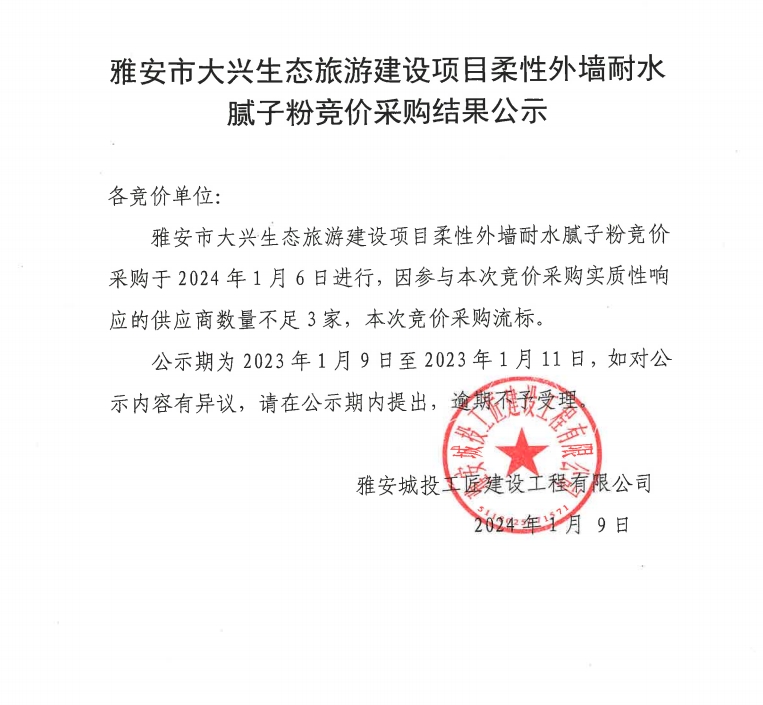 雅安市大興生態(tài)旅游建設(shè)項(xiàng)目柔性外墻耐水膩?zhàn)臃鄄牧细們r(jià)采購結(jié)果公示