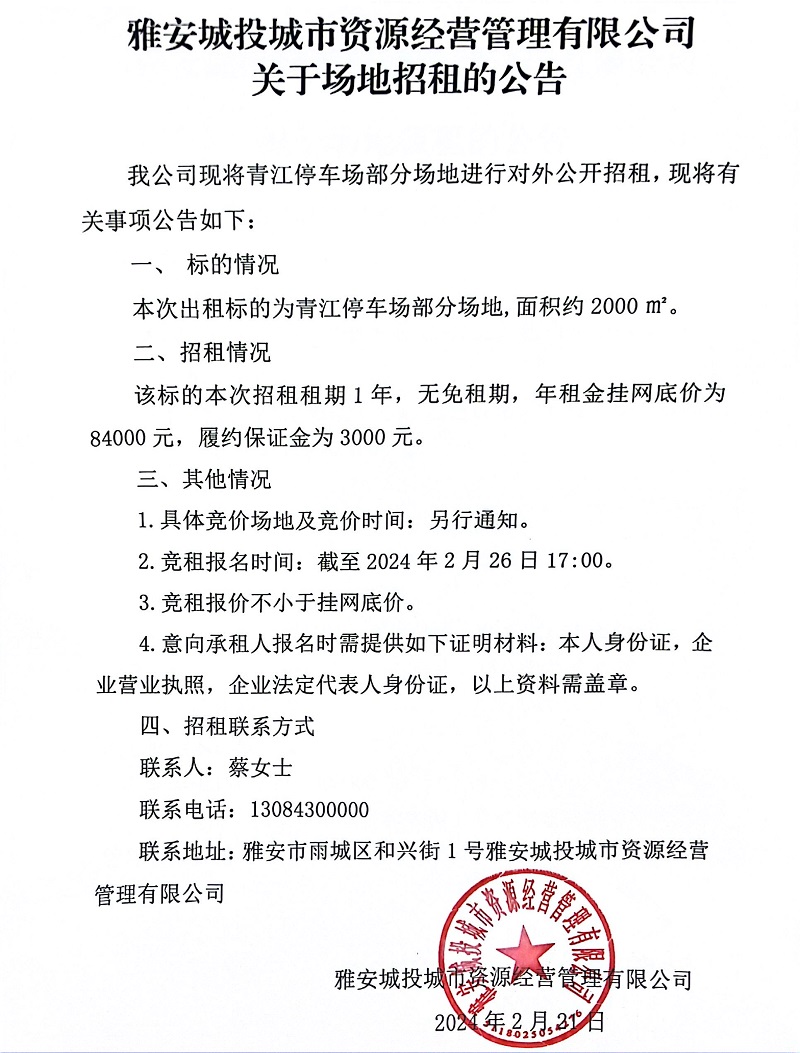 雅安城投城市資源經(jīng)營(yíng)管理有限公司關(guān)于場(chǎng)地招租的公告