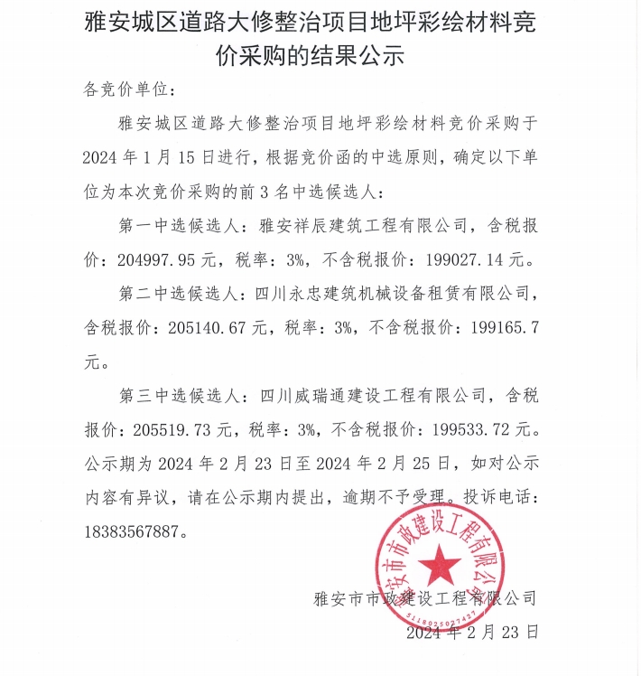 雅安城區(qū)道路大修整治項目地坪彩繪材料競價采購的結(jié)果公示