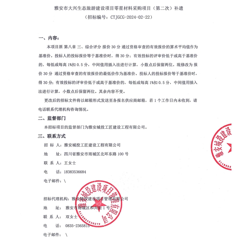 雅安市大興生態(tài)旅游建設項目零星材料采購項目(第二次)補遺公告