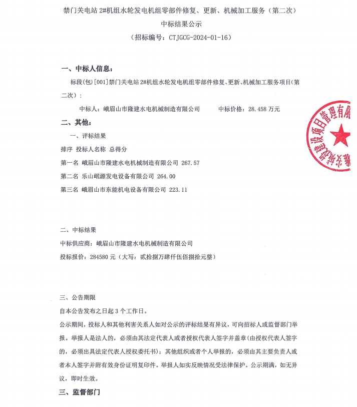 禁門關(guān)電站2#機(jī)組水輪發(fā)電機(jī)組零部件修復(fù)、更新、機(jī)械加工服務(wù)(第二次)中標(biāo)結(jié)果公示