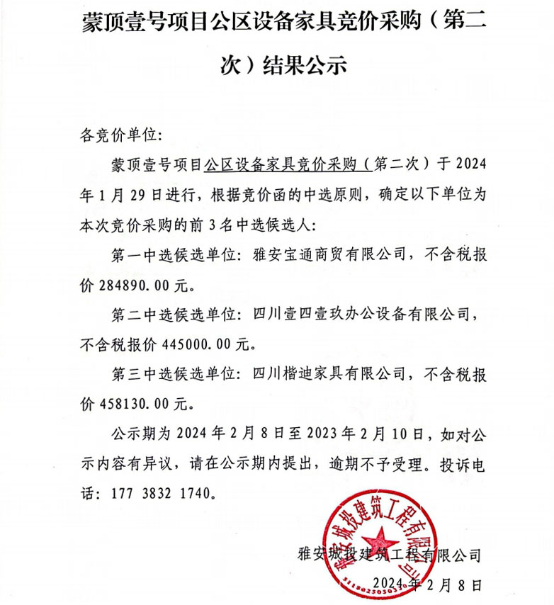 蒙頂壹號(hào)項(xiàng)目公區(qū)設(shè)備家具競(jìng)價(jià)采購(gòu)(第二次)結(jié)果公示
