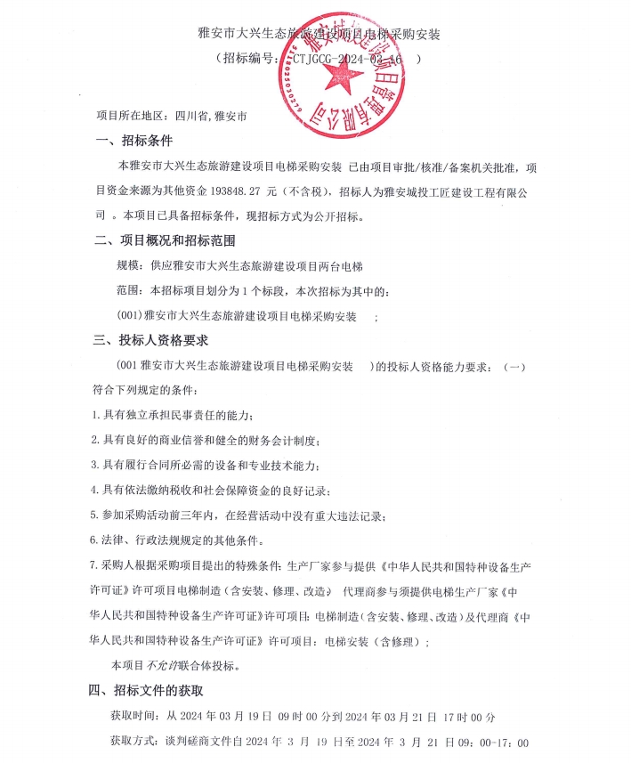 雅安市大興生態(tài)旅游建設(shè)項(xiàng)目電梯采購(gòu)安裝公告