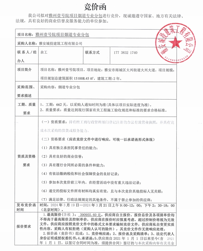 雅州壹號院項目煙道專業(yè)分包競價公告