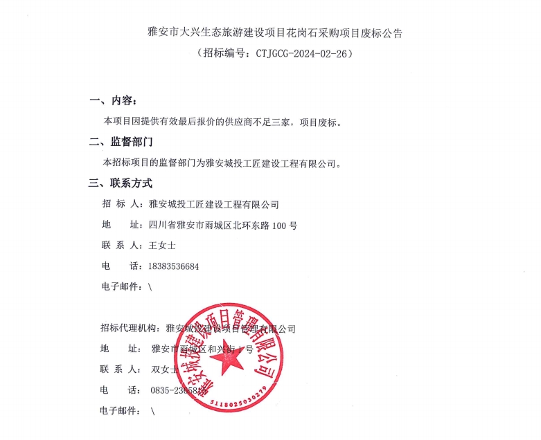 雅安市大興生態(tài)旅游建設(shè)項目花崗石采購項目廢標(biāo)公告