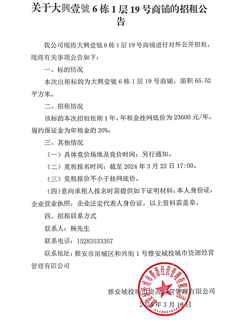 關(guān)于大興壹號(hào)6棟1層19號(hào)商鋪的招租公告