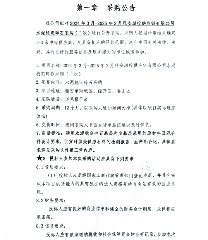 2024年3月-2025年2月雅安城投供應(yīng)鏈有限公司水泥穩(wěn)定碎石采購(二次)公告