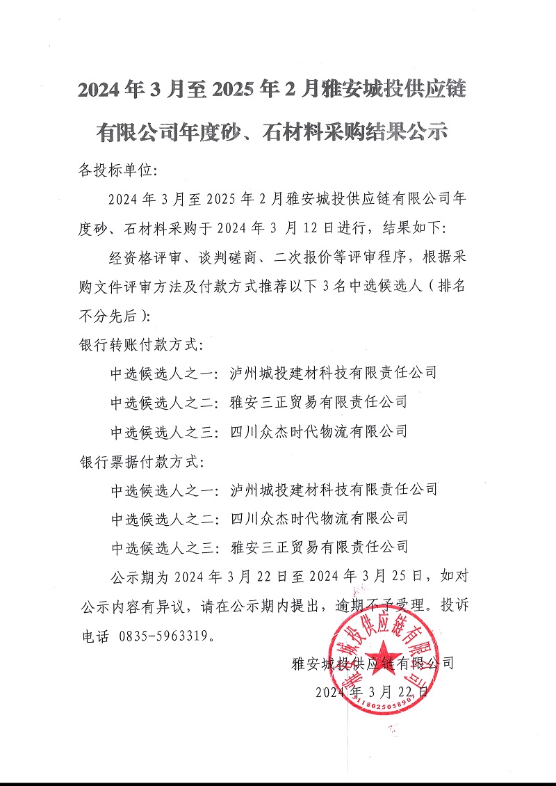 2024年3月至2025年2月雅安城投供應鏈有限公司年度砂、石材料采購結果公示