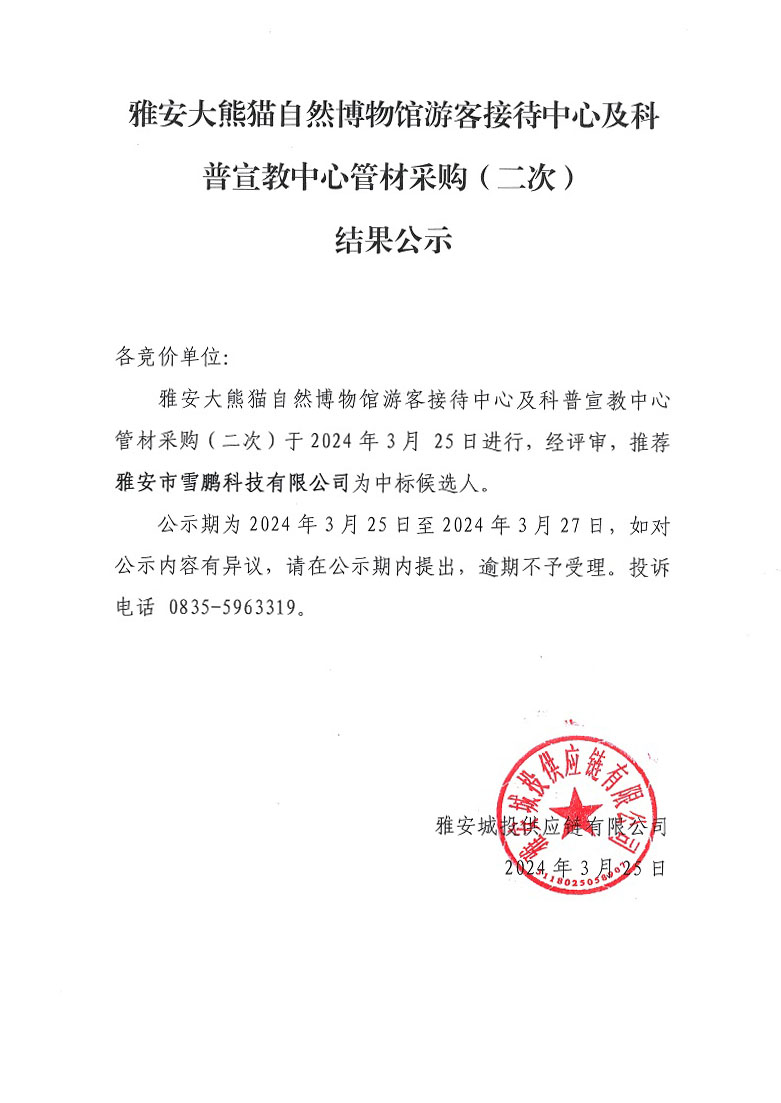 雅安大熊貓自然博物館游客接待中心及科普宣教中心管材采購(二次)結果公示