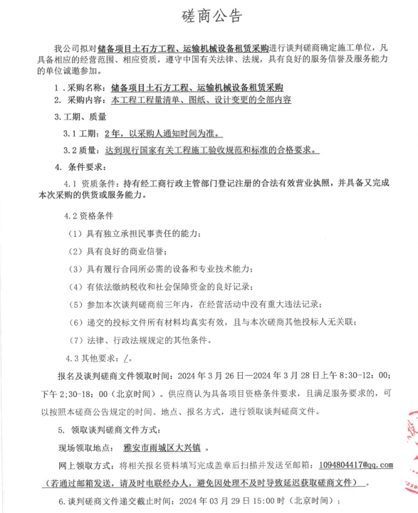 儲備項目土石方工程、運輸機械設備租賃采購磋商公告