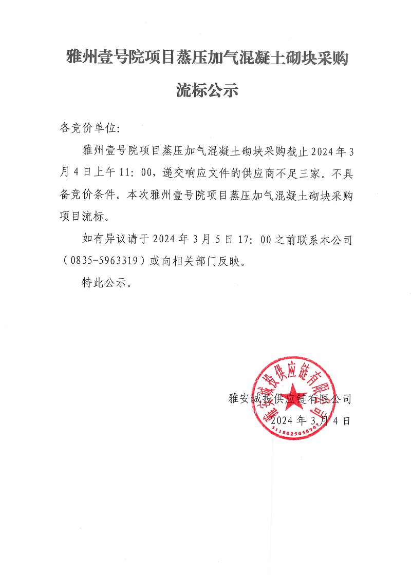 雅州壹號(hào)院項(xiàng)目蒸壓加氣混凝土砌塊采購(gòu)流標(biāo)公示