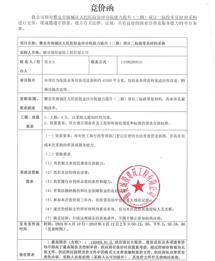 雅安市雨城區(qū)人民醫(yī)院金沙分院能力提升(二期)項目二標(biāo)段零星材料采購競價公告