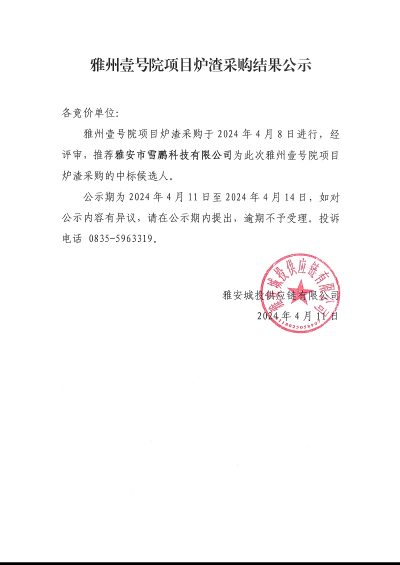 雅州壹號院項(xiàng)目爐渣采購結(jié)果公示
