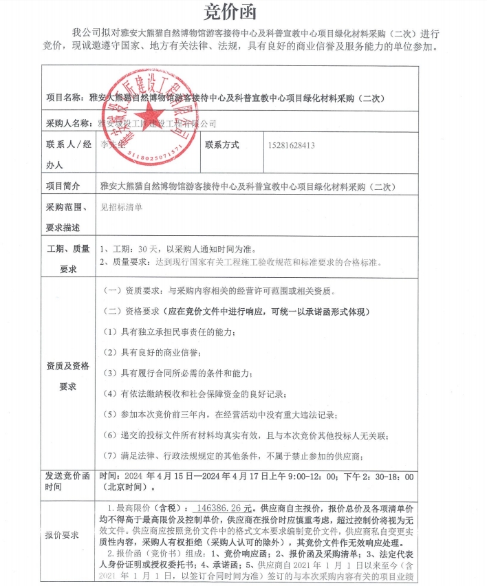 雅安大熊貓自然博物館游客接待中心及科普宣教中心項目綠化材料采購(二次)競價公告