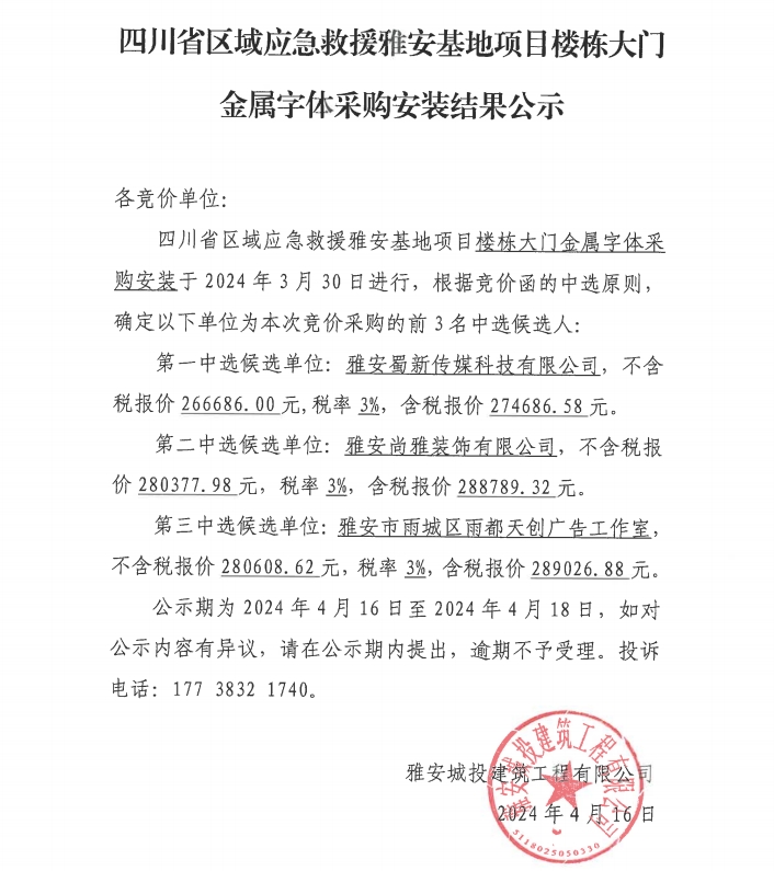 四川省區(qū)域應(yīng)急救援雅安基地項(xiàng)目樓棟大門(mén)金屬字體采購(gòu)安裝結(jié)果公示