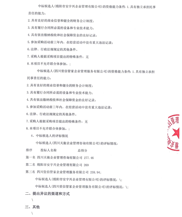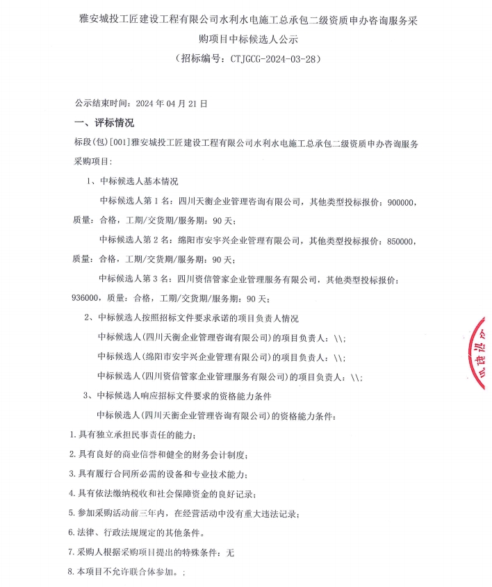 雅安城投工匠建設(shè)工程有限公司水利水電施工總承包二級資質(zhì)申辦咨詢服務(wù)采購項目中標(biāo)候選人公示