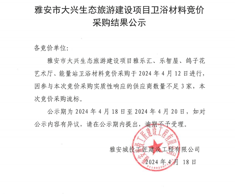 雅安市大興生態(tài)旅游建設(shè)項(xiàng)目衛(wèi)浴材料競價采購結(jié)果公示