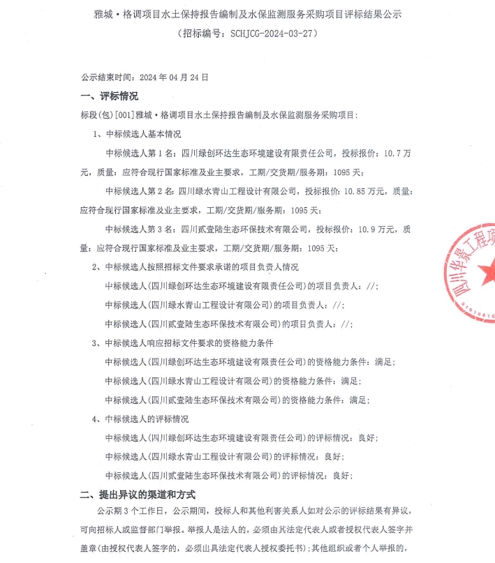 雅城·格調(diào)項(xiàng)目水土保持報(bào)告編制及水保監(jiān)測服務(wù)采購項(xiàng)目評標(biāo)結(jié)果公示