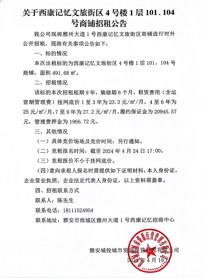 關(guān)于西康記憶文旅街區(qū)4號樓1層101、104號商鋪招租公告