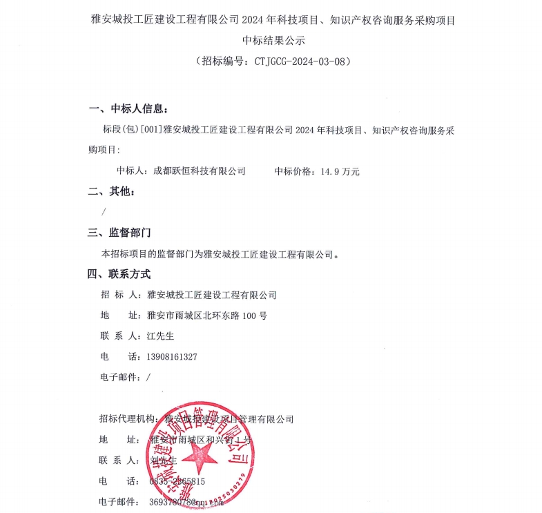 雅安城投工匠建設(shè)工程有限公司2024年科技項目、知識產(chǎn)權(quán)咨詢服務(wù)采購項目中標(biāo)結(jié)果公示