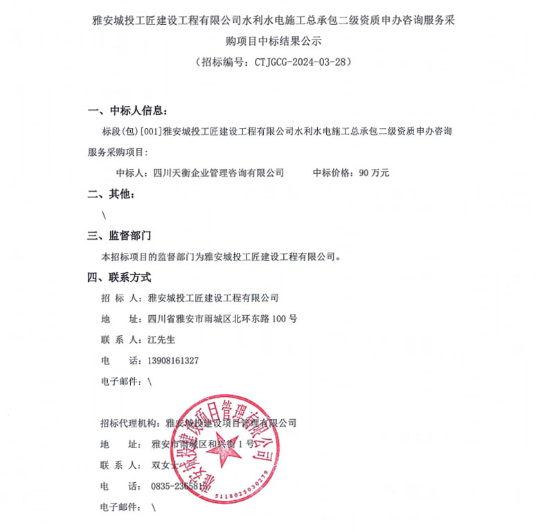 雅安城投工匠建設(shè)工程有限公司水利水電施工總承包二級資質(zhì)申辦咨詢服務(wù)采購項目中標(biāo)結(jié)果公示