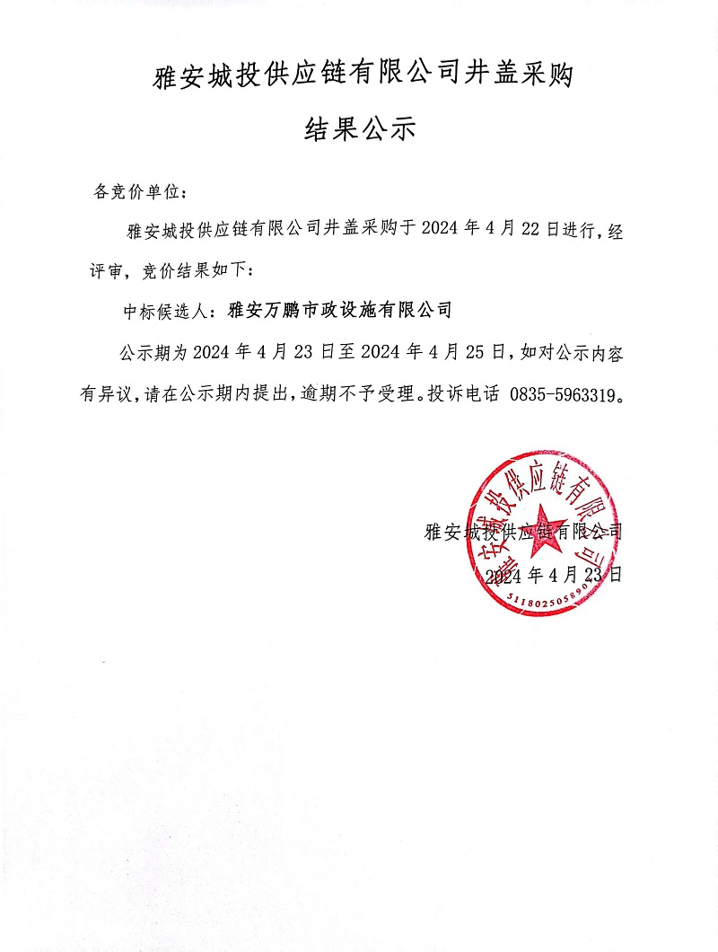 雅安城投供應(yīng)鏈有限公司井蓋采購(gòu)結(jié)果公示