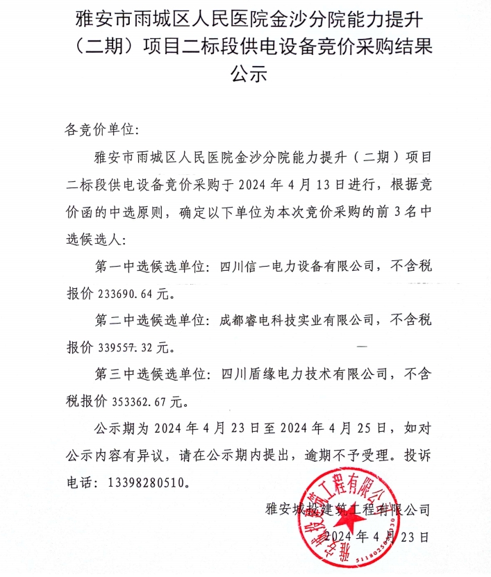 雅安市雨城區(qū)人民醫(yī)院金沙分院能力提升(二期)項(xiàng)目二標(biāo)段供電設(shè)備競(jìng)價(jià)采購結(jié)果公示