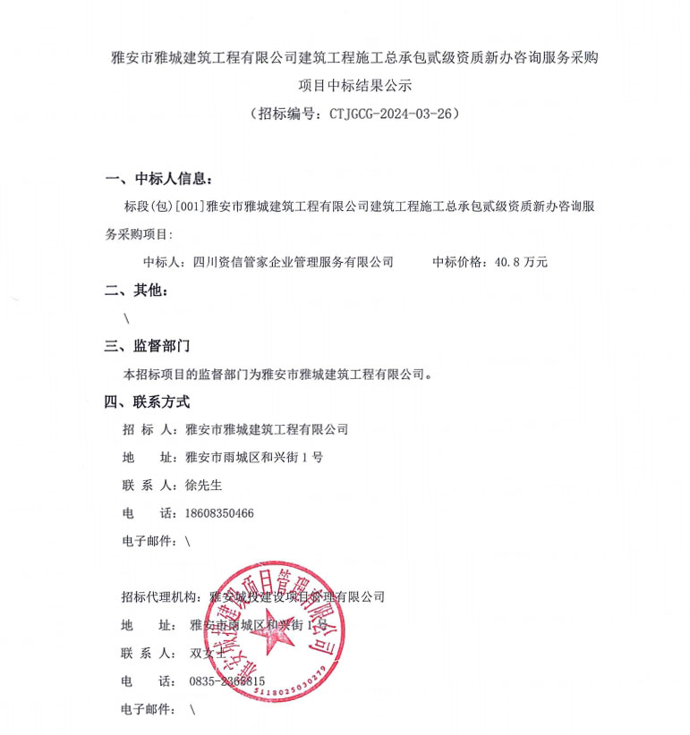雅安市雅城建筑工程有限公司建筑工程施工總承包貳級資質(zhì)新辦咨詢服務(wù)采購項(xiàng)目中標(biāo)結(jié)果公示