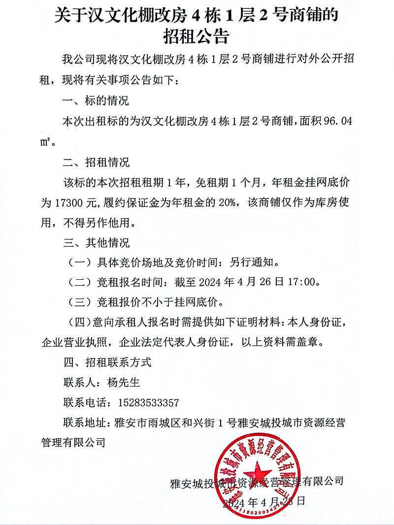關于漢文化棚改房4棟1層2號商鋪的招租公告