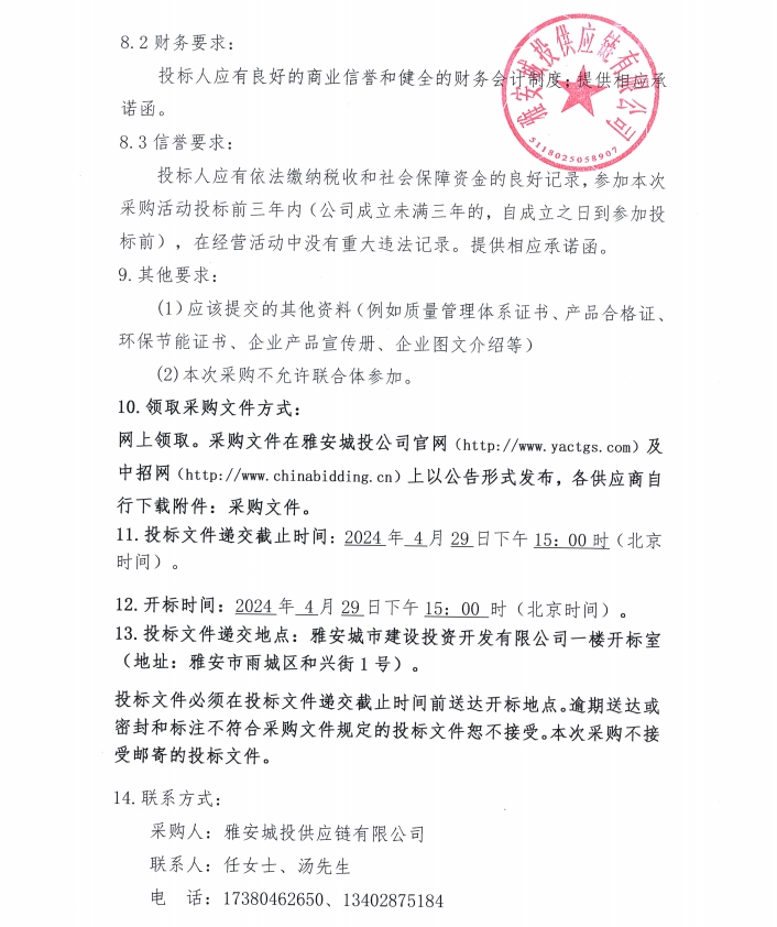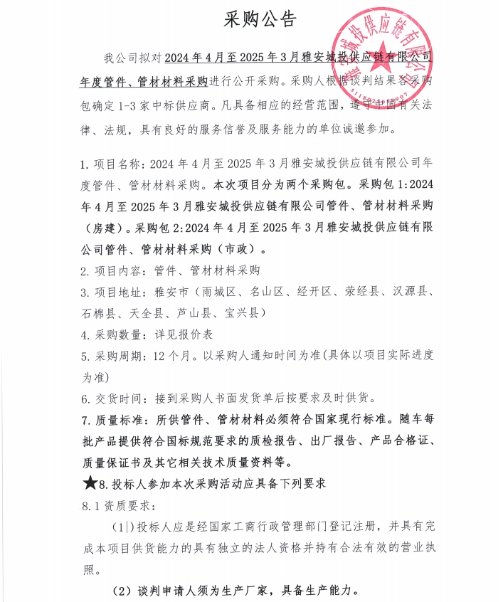 2024年4月至2025年3月雅安城投供應(yīng)鏈有限公司年度管件、管材材料采購(gòu)公告