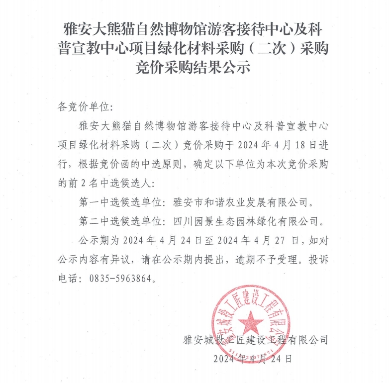 雅安大熊貓自然博物館游客接待中心及科普宣教中心項目綠化材料采購(二次)競價采購結(jié)果公示