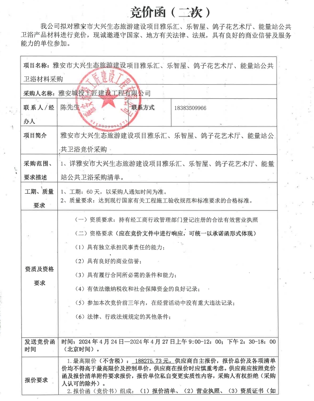 雅安市大興生態(tài)旅游建設(shè)項(xiàng)目雅樂匯、樂智屋、鴿子花藝術(shù)廳、能量站公共衛(wèi)浴材料采購(第二次)競價(jià)公告