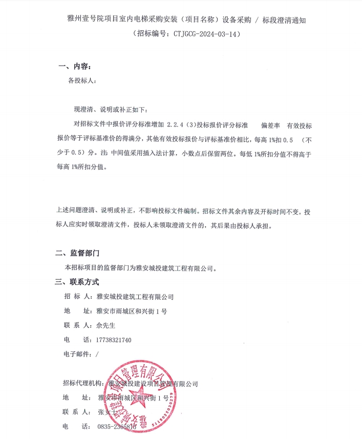 雅州壹號(hào)院項(xiàng)目室內(nèi)電梯采購安裝(項(xiàng)目名稱)設(shè)備采購/標(biāo)段澄清通知
