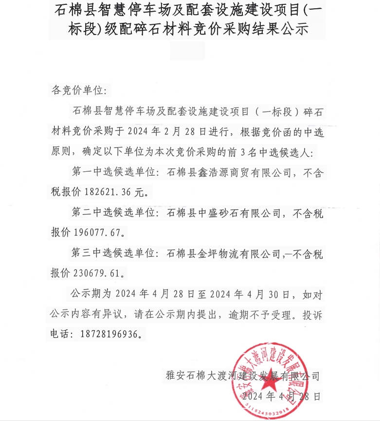 石棉縣智慧停車場及配套設(shè)施建設(shè)項目(一標(biāo)段)級配碎石材料競價采購結(jié)果公示