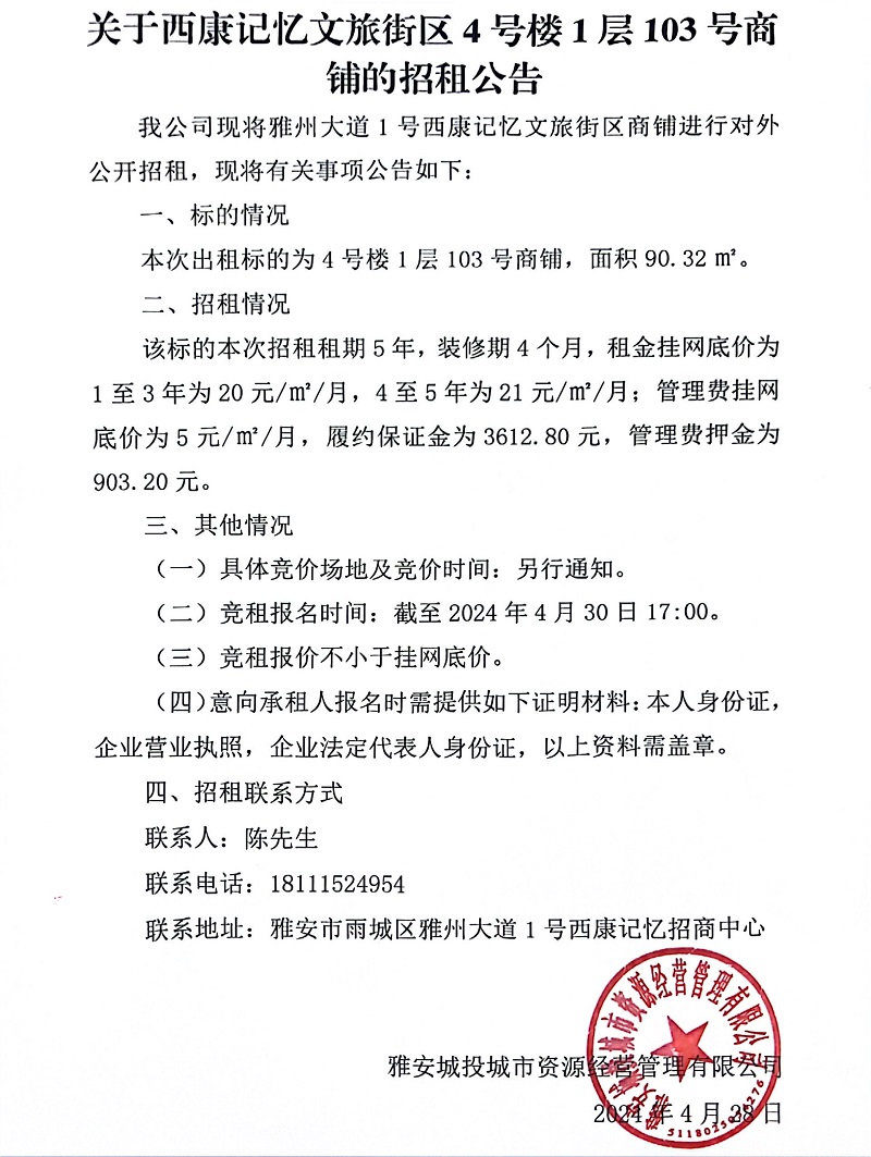 關(guān)于西康記憶文旅街區(qū)4號樓1層103號商鋪的招租公告