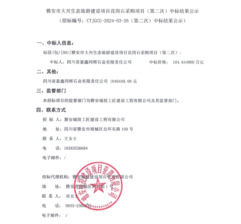雅安市大興生態(tài)旅游建設(shè)項目花崗石采購項目(第二次)中標結(jié)果公示
