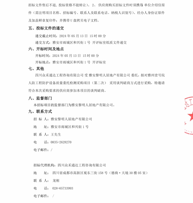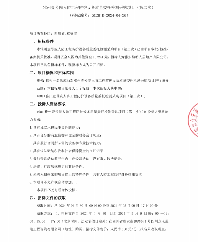 雅州壹號(hào)院人防工程防護(hù)設(shè)備質(zhì)量委托檢測(cè)采購(gòu)項(xiàng)目(第二次)公告