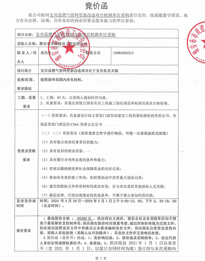 寶興縣燃?xì)夤芫W(wǎng)更新改造項(xiàng)目檢測(cè)單位采購(gòu)競(jìng)價(jià)公告