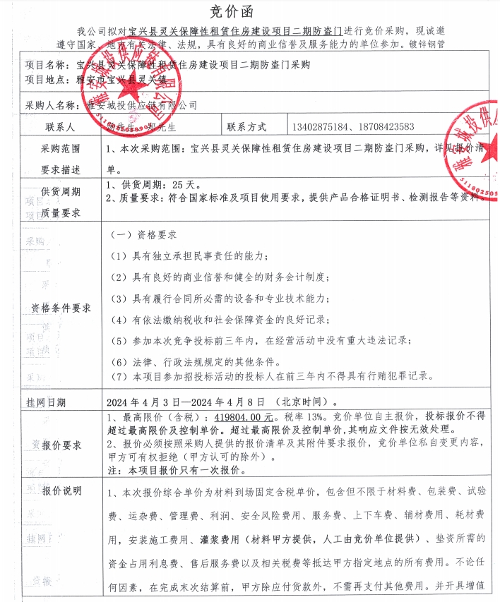 寶興縣靈關(guān)保障性租賃住房建設項目二期防盜門采購競價公告